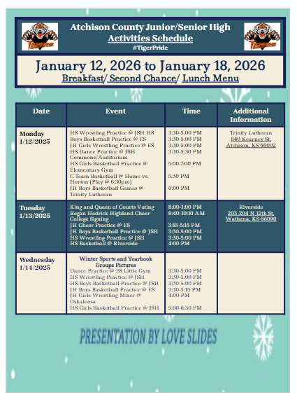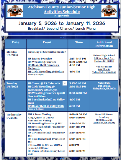 January 12, 2026 to January 18, 2026 [Monday, Jan 12 at 2:02 PM]Updated PDF, as well as time changes, leave times added, Spirit Dress up Days, as well as links to event information. [Monday, Jan 1...